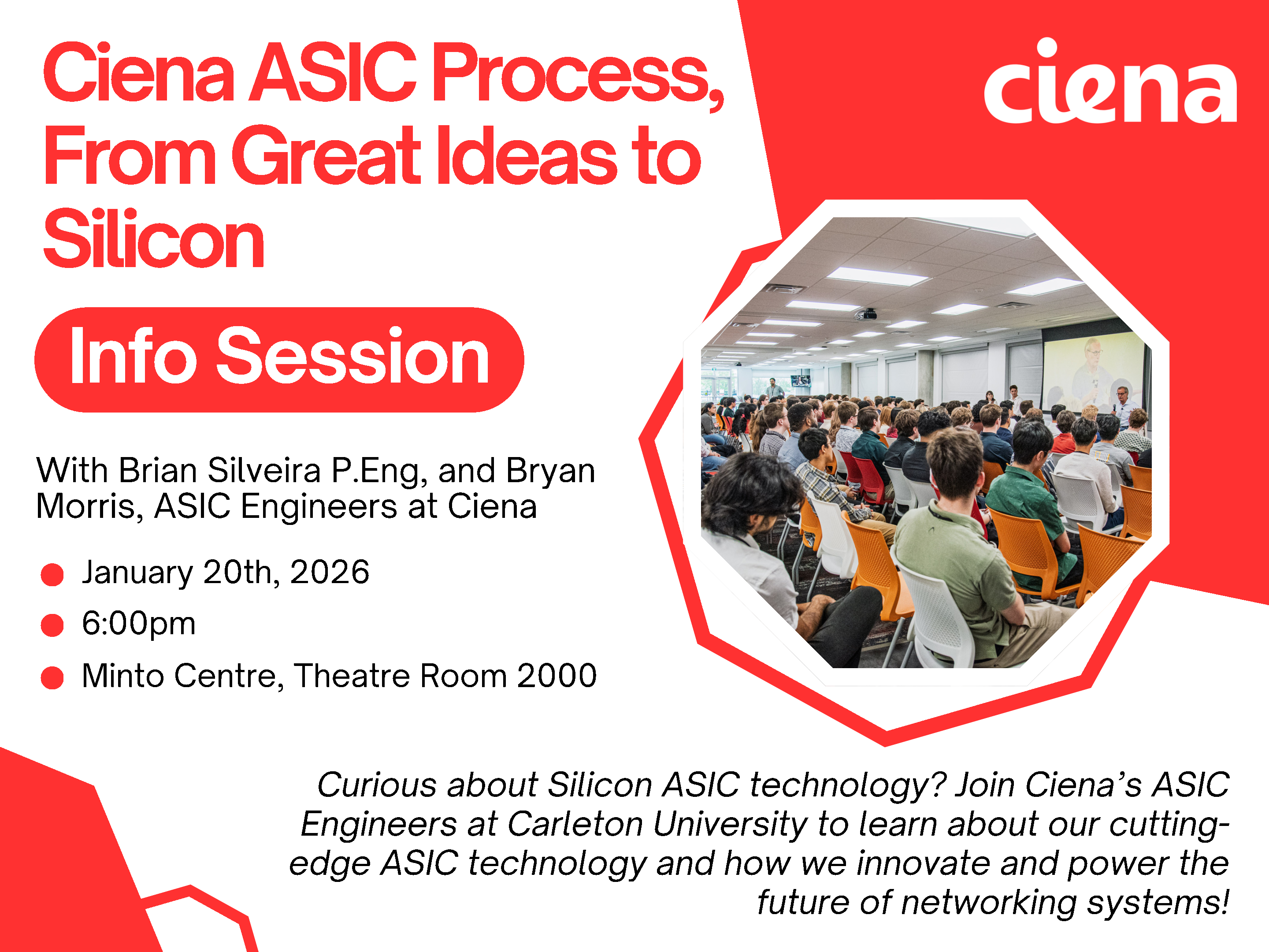 Curious about Silicon ASIC technology? Join Ciena's ASIC Engineers at Carleton University to learn about our cutting-edge ASIC technology and how we innovate and power the future of networking systems! Learn about career opportunities in hardware engineering at Ciena and meet our talented engineers (Brian Silveira P.Eng and Bryan Morris) who develop the latest networking technology that connects people across the globe. We're a global leader in optical and routing systems, services, and automation software. Ciena is home to co-ops, interns, and graduates across the globe. Our programs engage early-in-career professionals to work on real projects involving next-generation technologies.