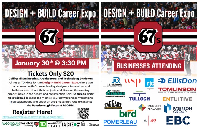 Connect with Ottawa's leading designers, innovators, and builders! Learn about their projects and discover the exciting opportunities in the design and construction field. Be sure to bring your resume to make the most of your networking conversations (this is a chance for students to discuss potential co-op/internship positions and new grad employment opportunities). Then stick around to cheer on the 67's as they face off against the Peterborough Petes!