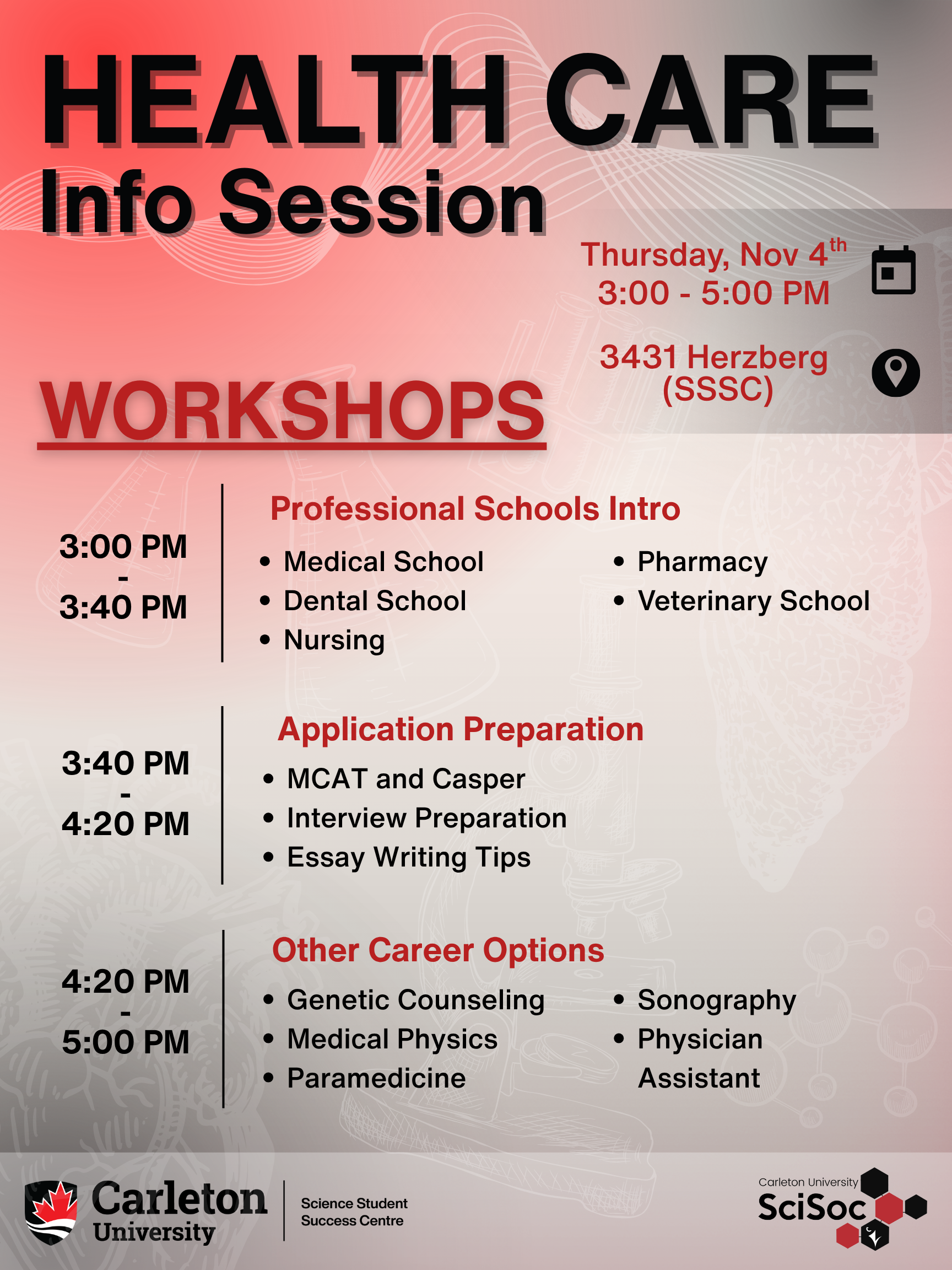Please Note: Photographs and/or video will be taken at this event. By entering the event premises, you consent to photography, audio recording, and video recording to be used by the Science Student Success Centre at Carleton University. Click here to view the full length, Photo Consent Notice.